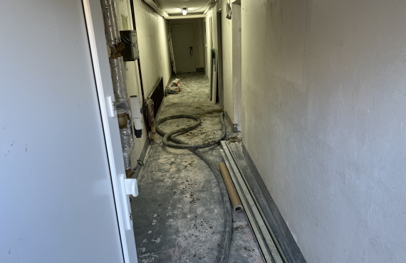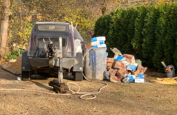3 Schaufeln Gesteinskörnung, dazu eine Schaufel mit Zement und ein wenig Wasser - dann mit entsprechenden Leitungen in die Räume "transportiert".