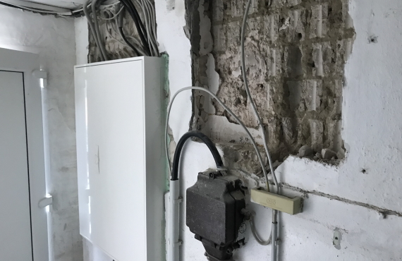 Der neue Verteilerschrank wurde hinter der Eingangstür installiert. Vom alten Schrank ist nicht mehr viel zu sehen.