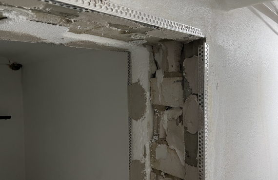 Im Eingangsbereich zum alten Kühlraum wurden Eckprofile gesetzt, um die Herstellung präziser Außenkanten im Trockenbau zu ermöglichen. Hier entsteht der "neue" Raum für die "Lagerung" der Tennisschuhe.