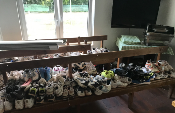 Trotz mehrfacher Ankündigungen lagen leider im Flur noch ca. 200 Tennisschuhe, die wir oben im Clubhaus aufgereiht haben.